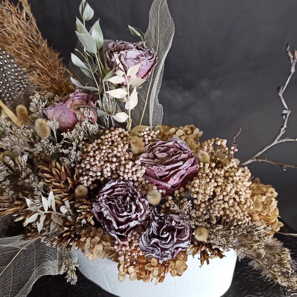 Кашпо – 1 шт.Кенийская роза – 5 шт.озонтамус – 2 шт.Лимониум – 1 шт.иглица крашенная – 3 шт.пампасная трава – 3 шт.перья – 3 шт.Эвкалипт – 2 шт.Папоротник – 1 шт.