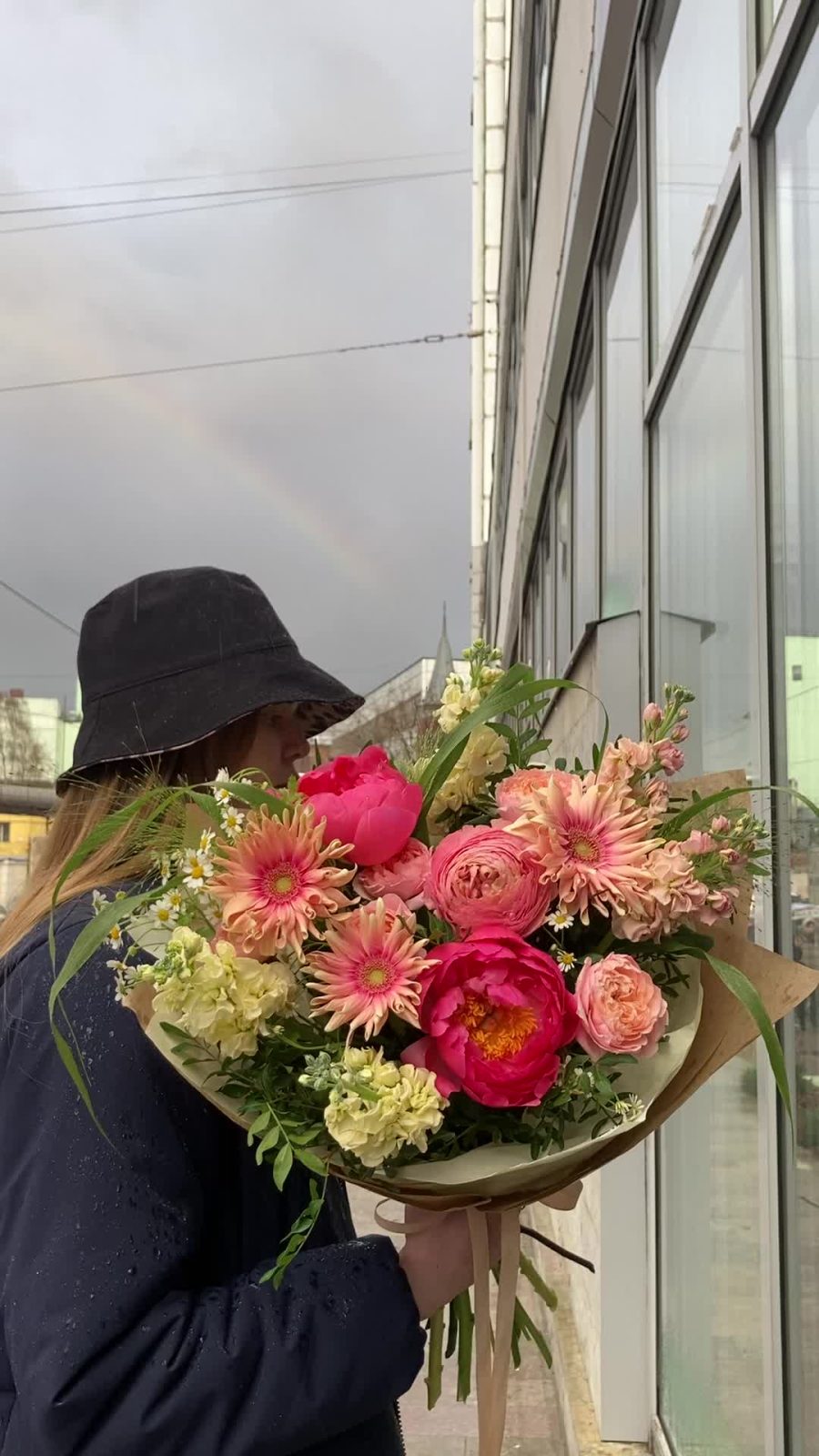 Пион – 2 шт.Роза кустовая пионовидная – 1 шт.матилла – 5 шт.гербера кучерявая – 3 шт.паникум грас – 3 шт.Ромашка кустовая – 2 шт.Фисташка – 3 шт.Упаковка дизайнерская – 1 шт.Лента атласная – 1 шт.