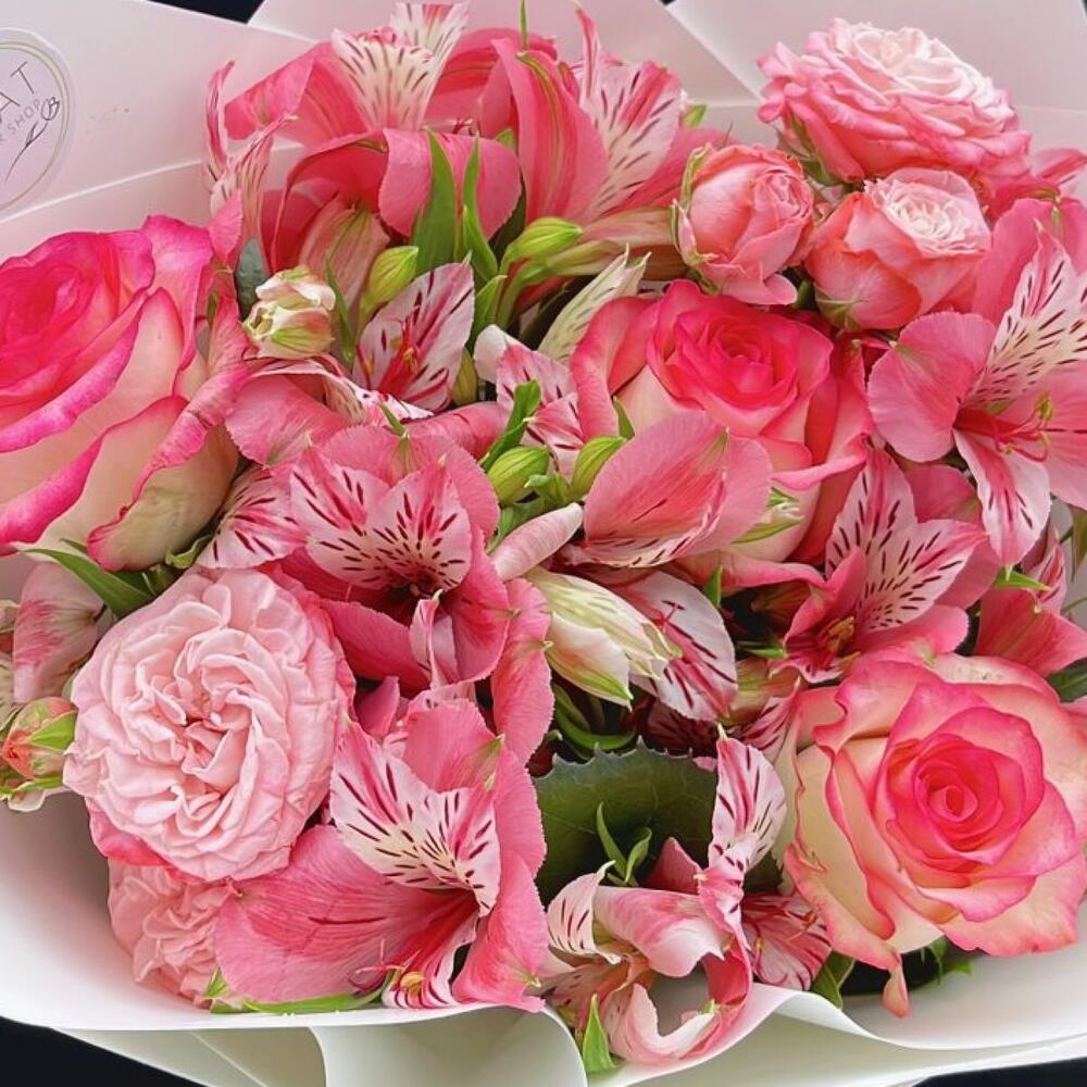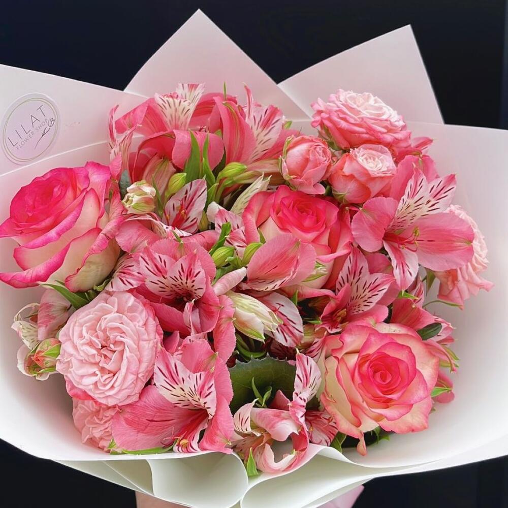 Альстромерии, Гвоздики, Кустовые розы, Лизиантусы, Розы, Хризантемы