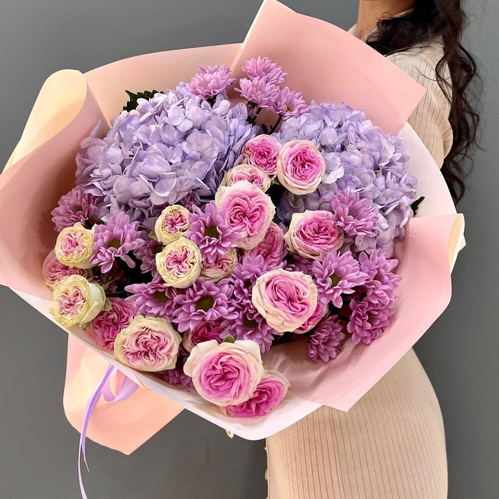 Альстромерии, Гвоздики, Кустовые розы, Лизиантусы, Розы, Хризантемы