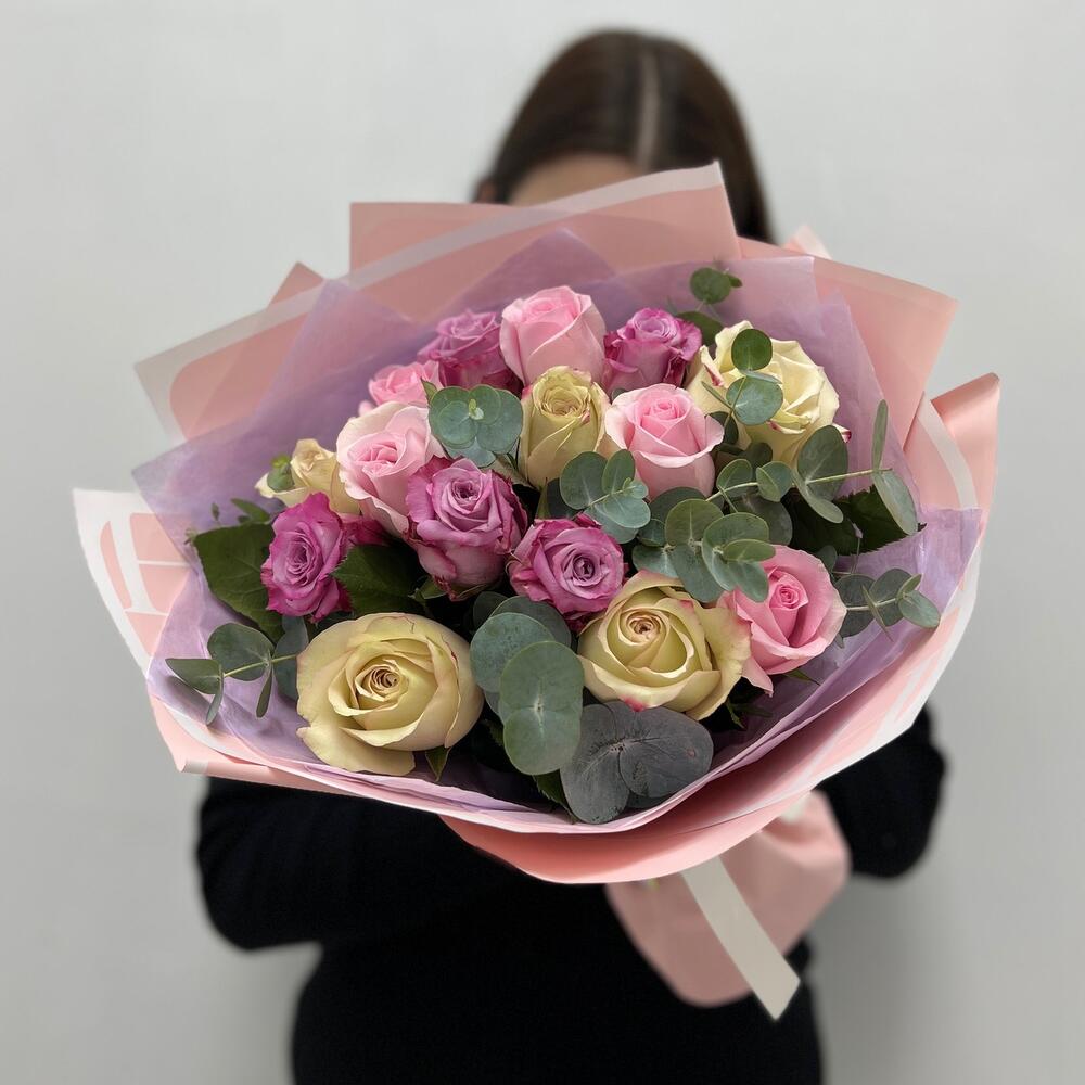 Упаковка дизайнерская – 1 шт.эвкалипт ветка – 1 шт.микс роз – 15 шт.