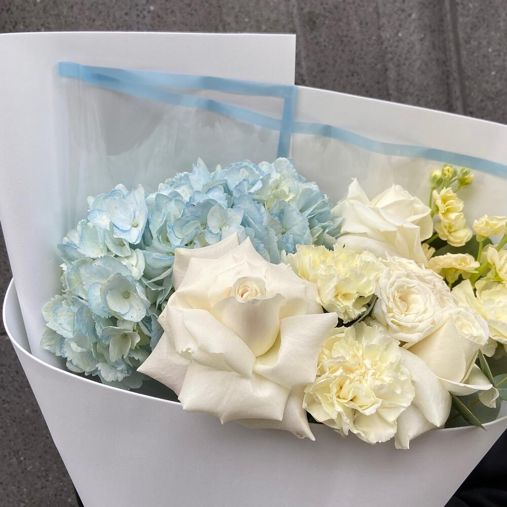 Гортензия – 1 шт.плая бланка – 3 шт.Маттиола – 2 шт.Кустовая роза – 1 шт.Диантус – 3 шт.Эвкалипт – 3 шт.Фоамиран (упаковка) – 2 шт.Подложка – 1 шт.Лента атласная – 2 шт.