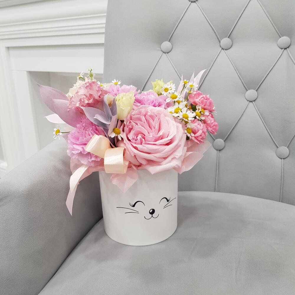 Роза пионовидная – 1 шт.Диантус – 4 шт.Диантус кустовой – 1 шт.Лизиантус – 1 шт.Матрикария – 1 шт.Коробка шляпная – 1 шт.Тишью – 1 шт.