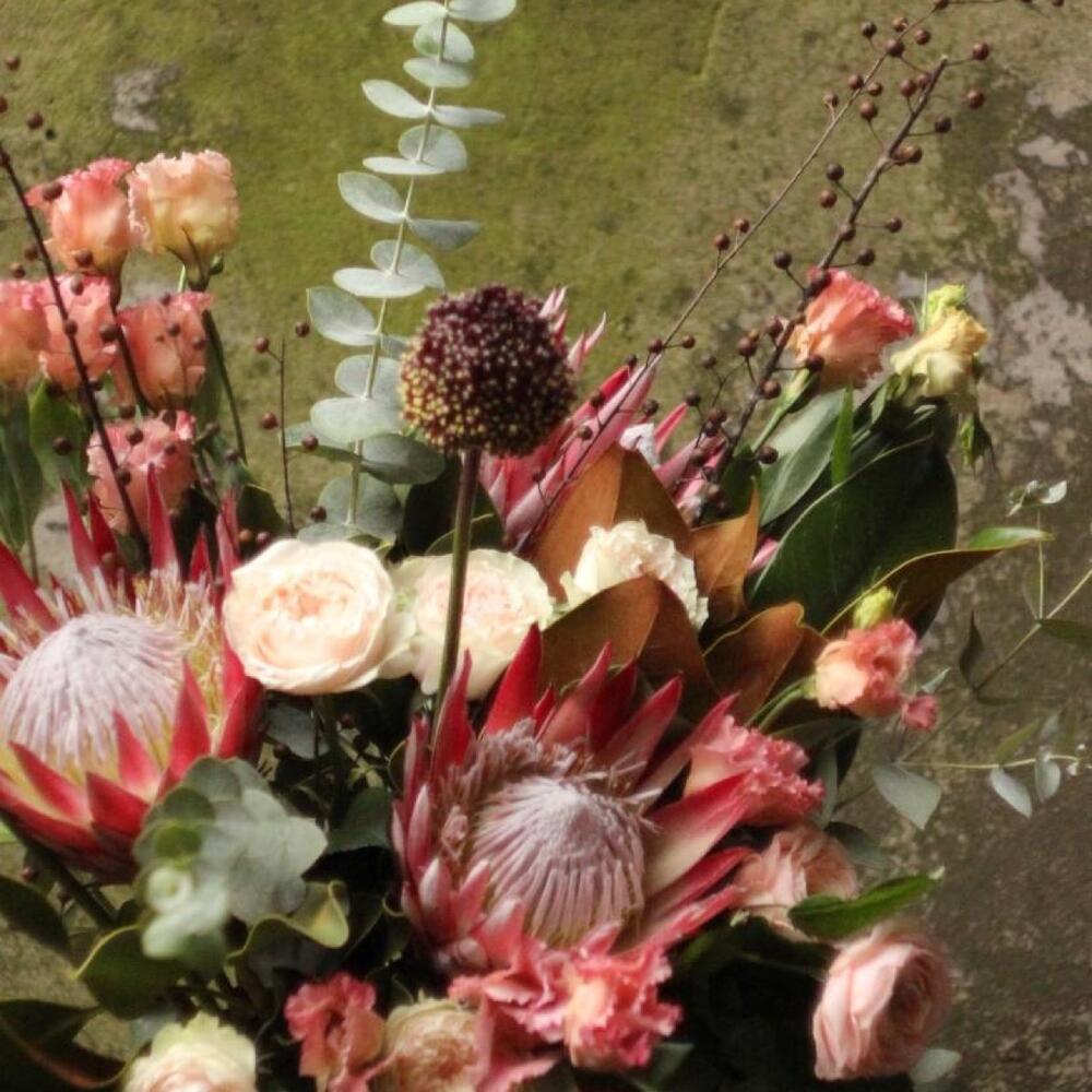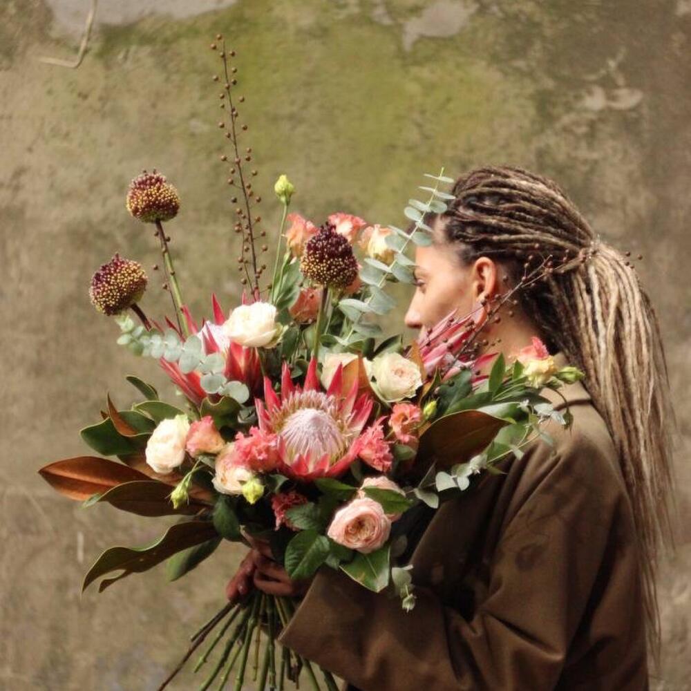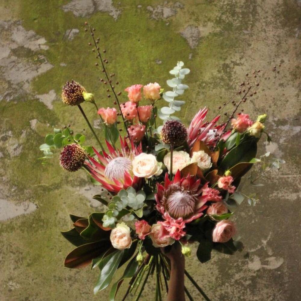 Авторский осенний букет с протеями, пионовидными розами, лизиантусом, ветками льна, аллиумом, листьями магнолии и эвкалиптом.