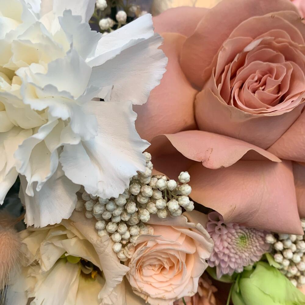 Альстромерии, Гвоздики, Кустовые розы, Лизиантусы, Розы, Хризантемы