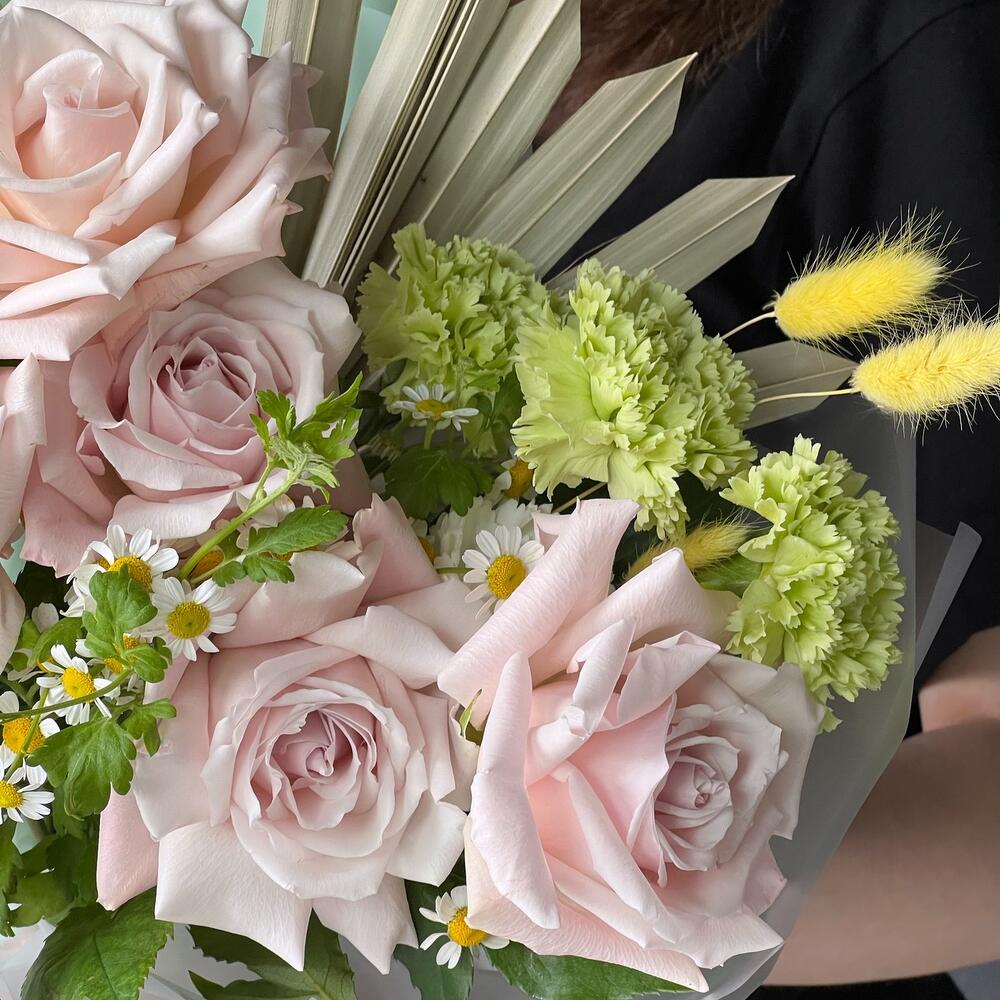 Стильный букет в крутейшем сочетании нежно розового и салатового. Каждая роза раскрыта вручную по специальной технике для большего «Вау!» эффекта.Не забудьте подрезать цветы перед тем как ставить в воду. Не храните букет на прямых солнечных лучах и возле отопительных … Показать ещёприборов, чтобы сохранить цветы как можно дольше.