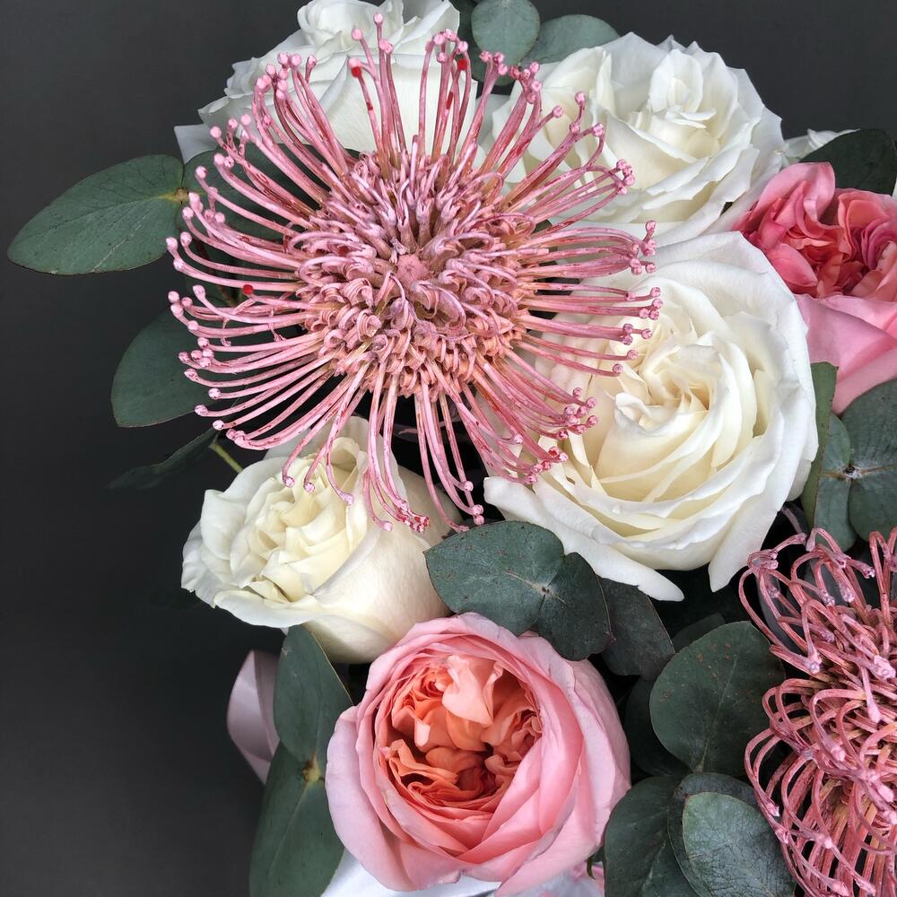 Огромная коробка с пионовидными розами и тропическими леукоспермумами. Когда хочется подарить не банальные розы