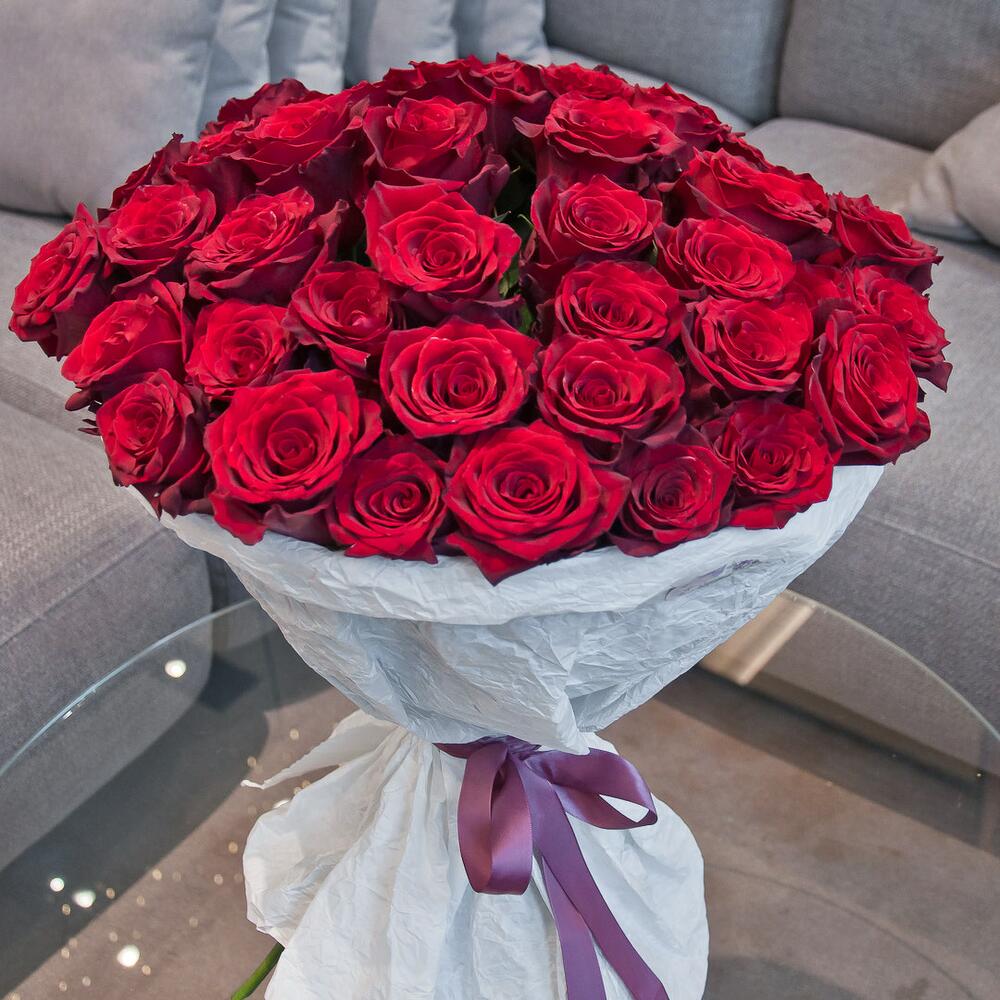 Розы красные (80 см) с атласной лентой, букет размера XL
