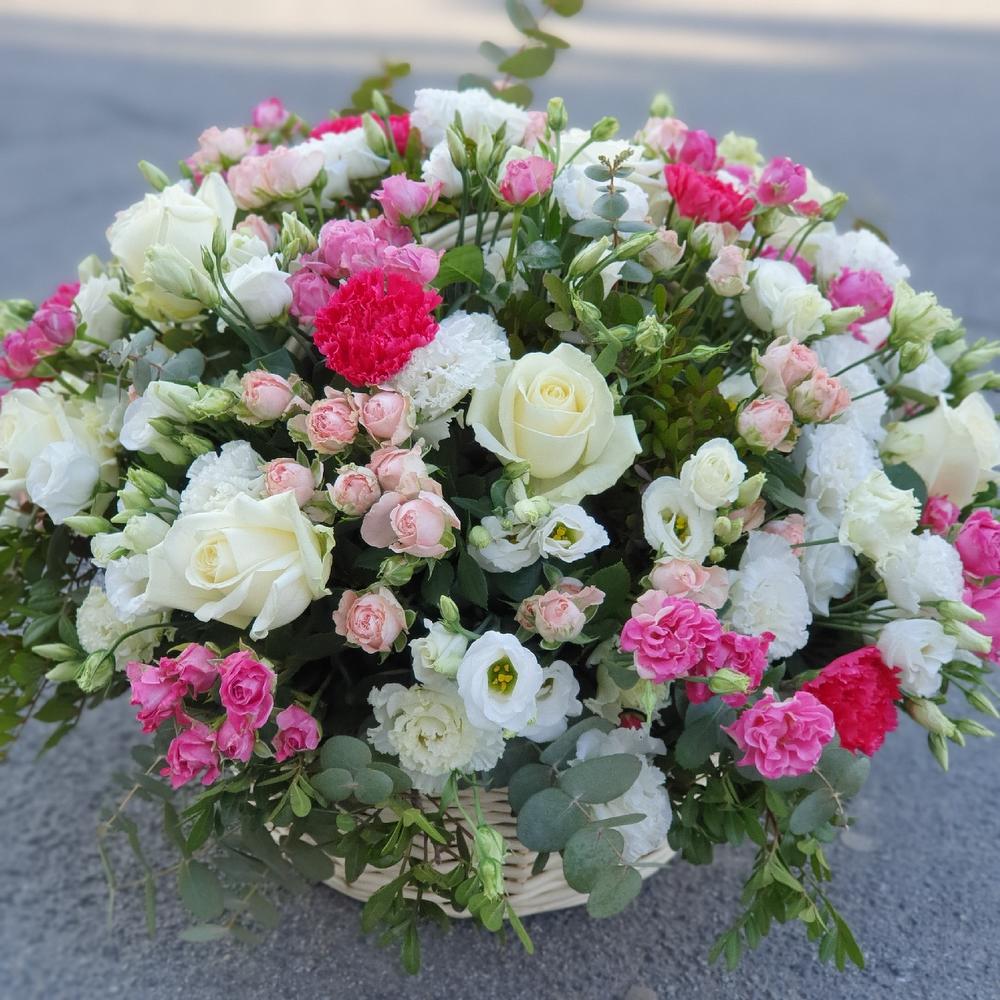 Корзина – 1 шт.Роза кустовая – 11 шт.Эвкалипт – 5 шт.Роза – 11 шт.Диантус – 7 шт.Оазис – 5 шт.Фисташка – 5 шт.Роза кустовая пионовидная – 11 шт.Лизиантус микс – 15 шт.