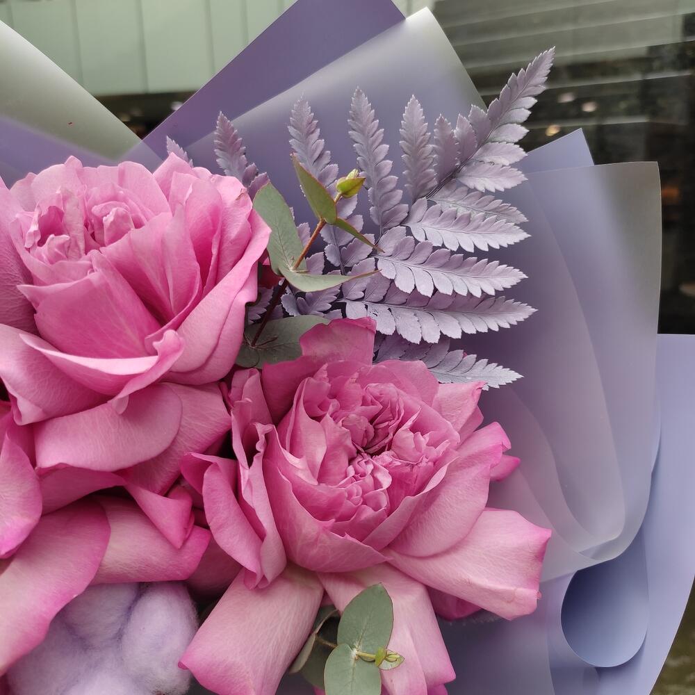 Роза пионовидная – 3 шт.Хлопок – 2 шт.Эвкалипт – 1 шт.Папоротник – 1 шт.Упаковка дизайнерская – 2 шт.Лента атласная – 2 шт.