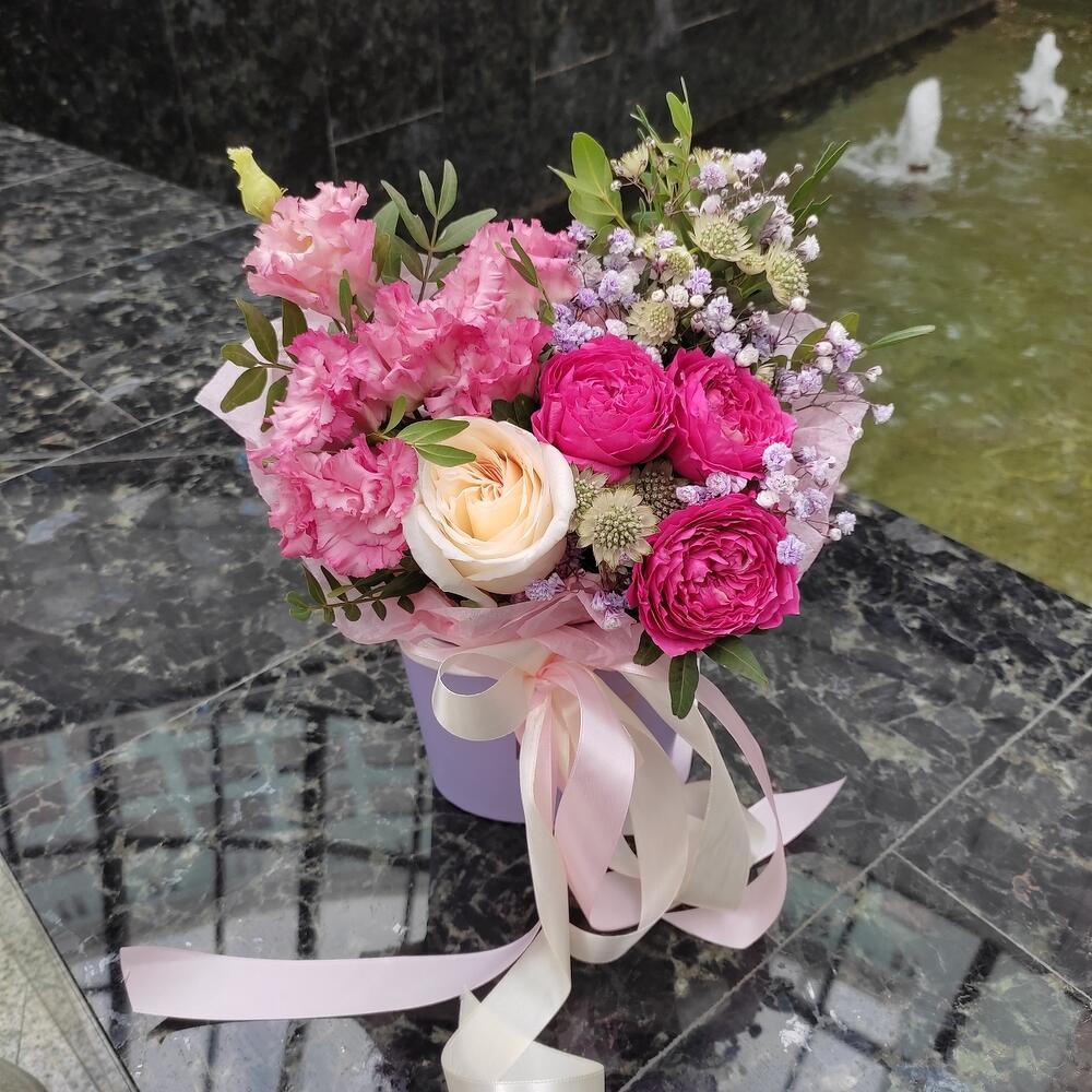 Лизиантус – 1 шт.Роза кустовая – 1 шт.Гипсофила – 1 шт.Астранция – 1 шт.Фисташка – 2 шт.Тишью – 1 шт.коробка 12*12 – 1 шт.