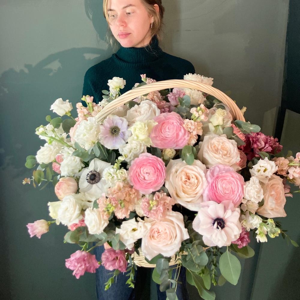 Анемон – 7 шт.Ранункулюс – 11 шт.Роза пионовидная – 15 шт.Лизиантус – 19 шт.Маттиола – 15 шт.Эвкалипт – 15 шт.Фисташка – 9 шт.Оазис флористический – 3 шт.Корзина – 1 шт.