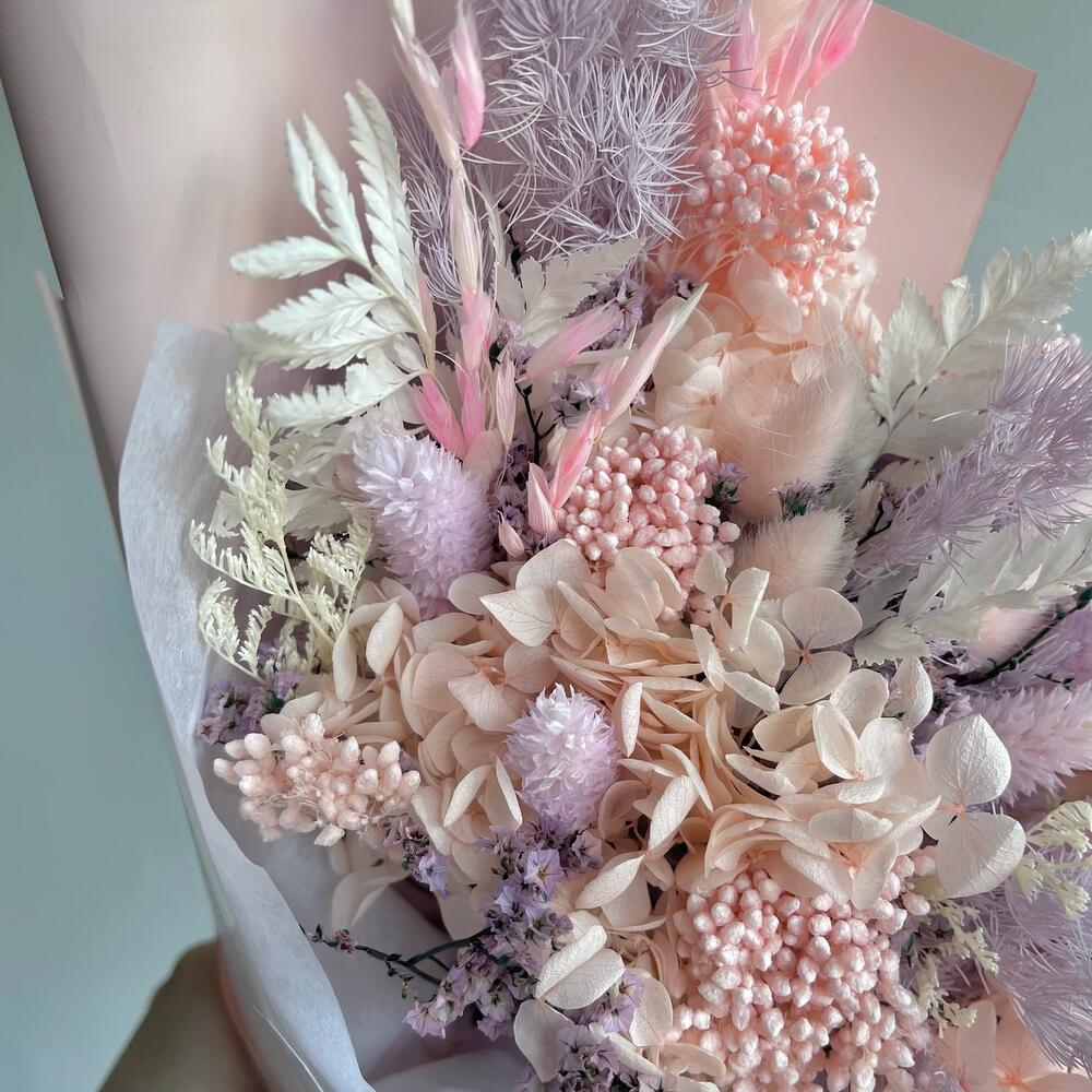 «Лавандовое созвездие» Букет из розы, гвоздики, статица и хлопка