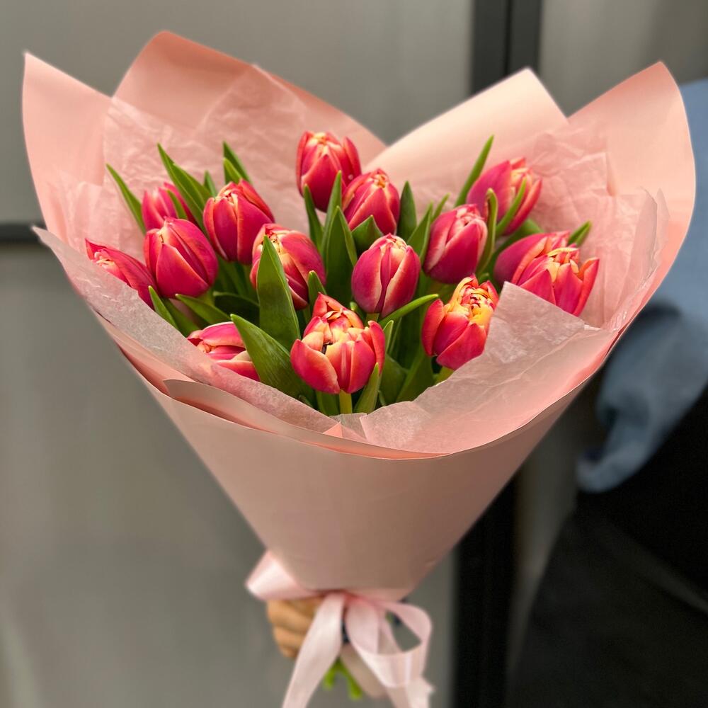 Тюльпан пионовидный – 15 шт.Тишью – 2 шт.Пленка матовая – 2 шт.Лента атласная – 2 шт.
